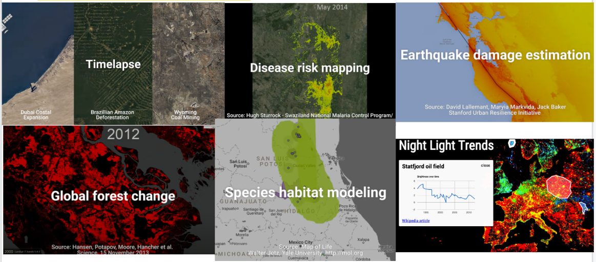 The Google Earth Engine, which is a cloud-based platform, is primarily used for urban planning, environmental monitoring, and other remote sensing capabilities. To see how other people have applied GEE, look at these projects below.