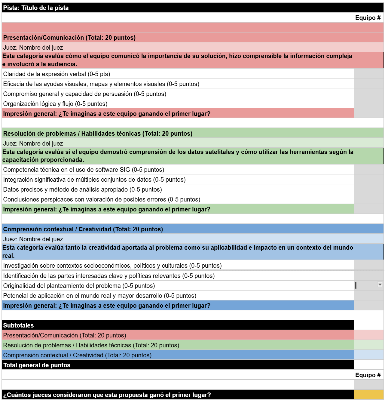 Asegúrate de entregarlo antes de la fecha límite. Los equipos pueden entregar un video breve (de 3 a 5 minutos de duración) además de la presentación, pero los videos no son obligatorios.